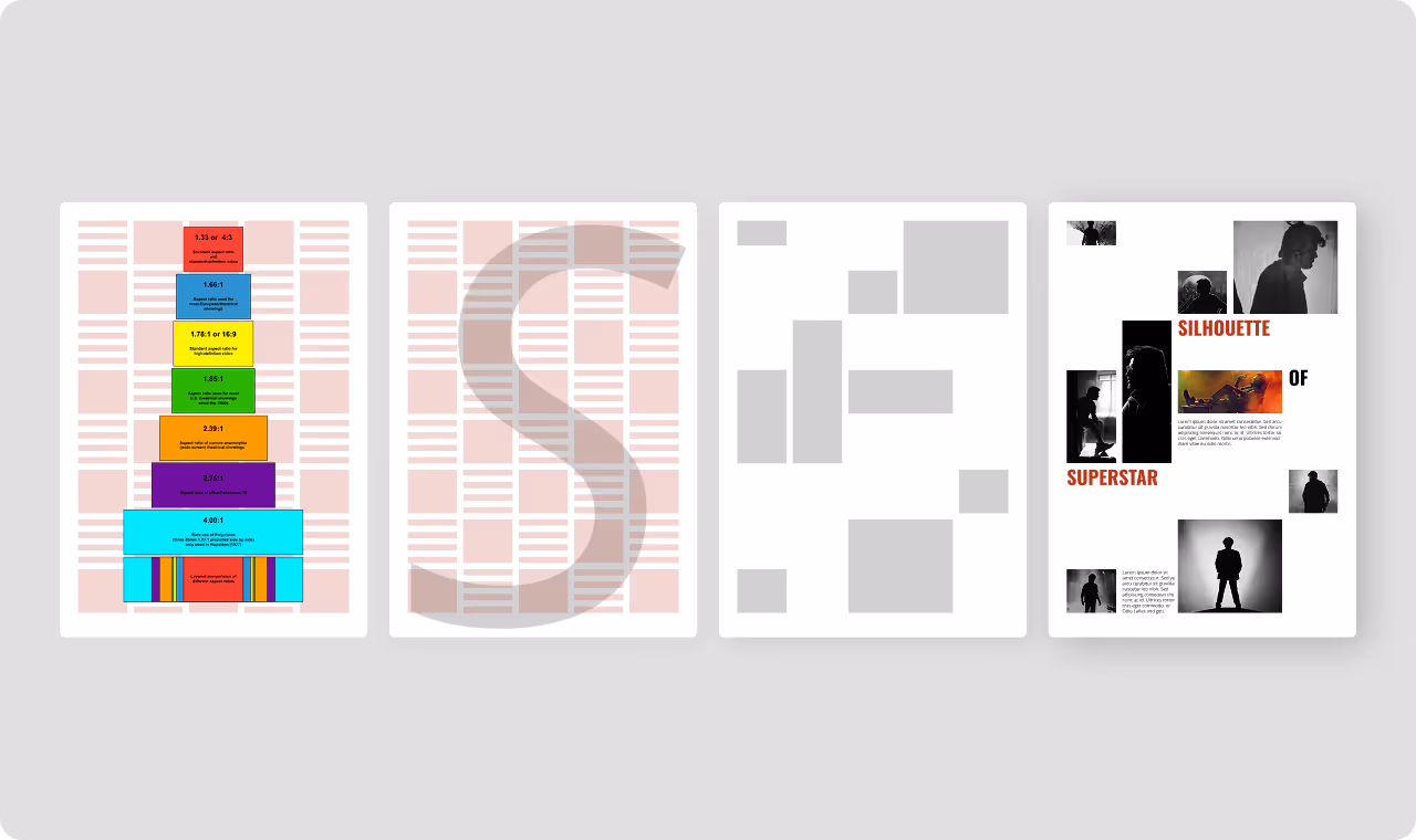 Finalizing the right grid was the main challenge. The layout explored film aspect ratios within a modular grid system. abstracting the letter s and creating a eye flow